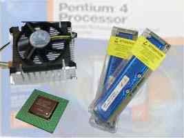原来在盒包P4的包装盒内,有一片P4处理器(废话),还有一个巨大的原装风扇,注意风扇上还有Intel的激光标志,散热片是灰白色的;哇,另外两条蓝色酷酷的东东是什么?认出来了没有?呵呵,这可是两片三星的64M